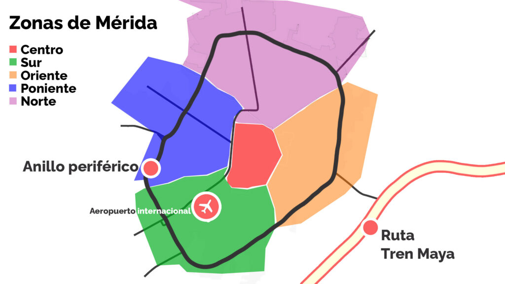 En el siguiente plano de la ciudad, podemos dividir a Mérida en 5 zonas: centro, norte, sur, poniente y oriente de igual manera observamos lo que es el anillo periférico, el aeropuerto internacional de Mérida y la ruta del Tren Meya el ultimo mega proyecto, el cual planea una manera de unir a los 3 estado que conforman la península de Yucatán.